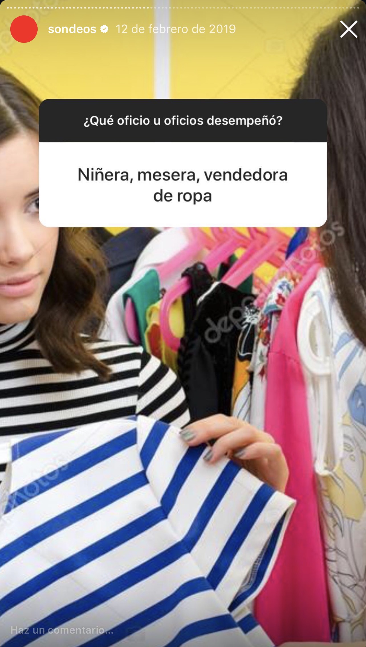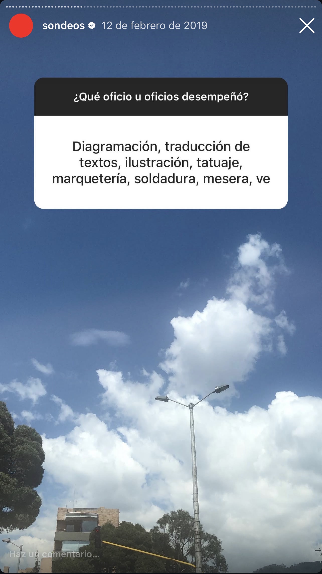 Sondeo 2019. Tres preguntas publicadas en stories del perfil @esferapublica en Instagram el 12 de febrero de 2019, entre las 12:25 y las 21:07. Pregunta 1: binaria (92% sí / 8% no). Pregunta 2: opción múltiple (negocios 23% / oficios varios 77%). Pregunta 3: respuesta abierta en texto libre; 41 respuestas recogidas, 60 oficios distintos identificados. Composición de la audiencia durante el sondeo: Colombia 47,3%; España 10,3%; México 9,5%; Argentina 7,8%; 19,4% no desagregado. Género: 55% mujeres / 45% hombres. Edad dominante: 25-34 (45%).