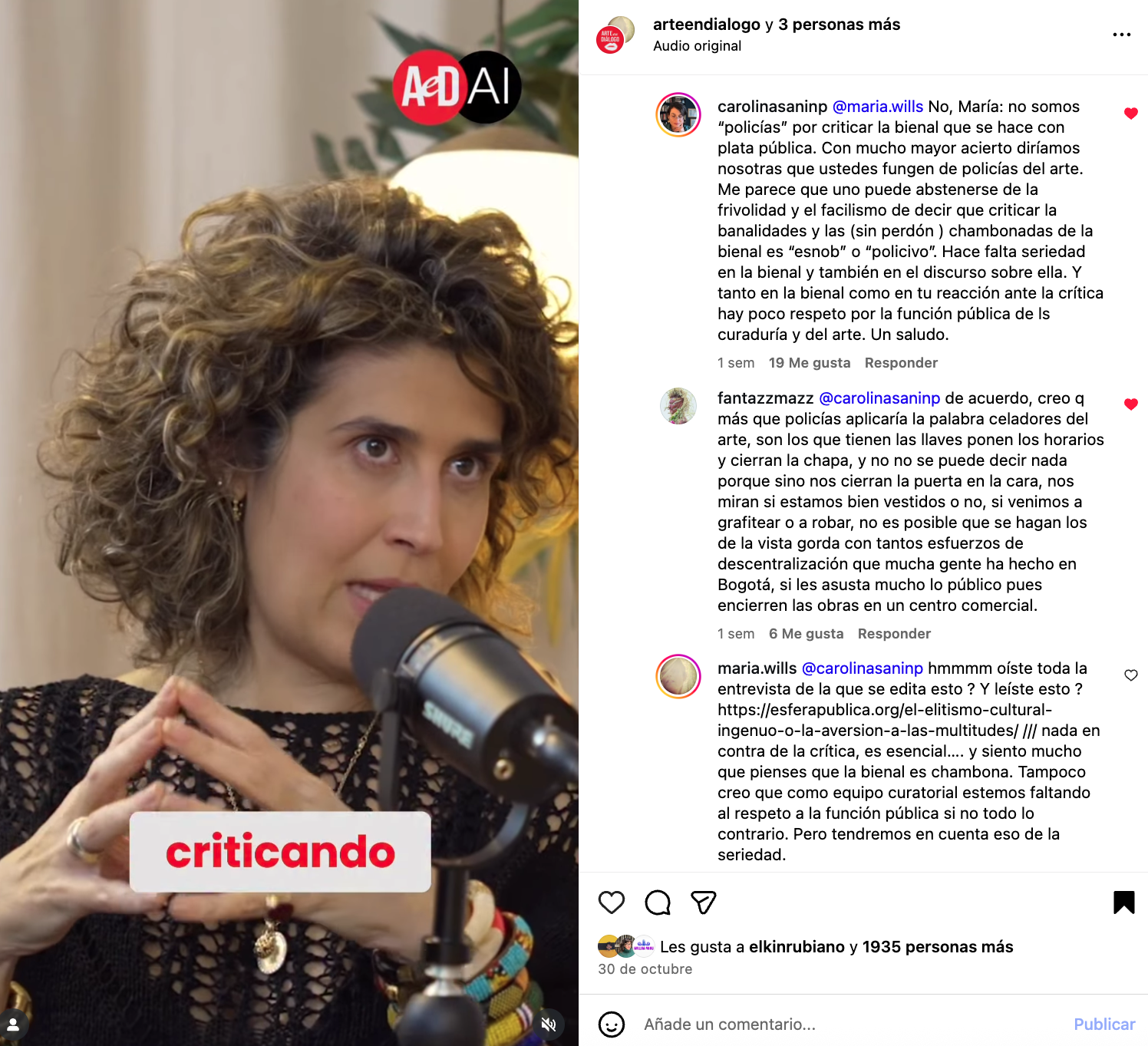 El punto álgido llegó cuando María Wills, miembro del comité curatorial, retomó la expresión «policía del arte» en una entrevista para Arte en Diálogo (Arteinformado), donde la crítica pasó a ser tratada como exceso, mientras la institución se colocó en el lugar del goce amenazado:
