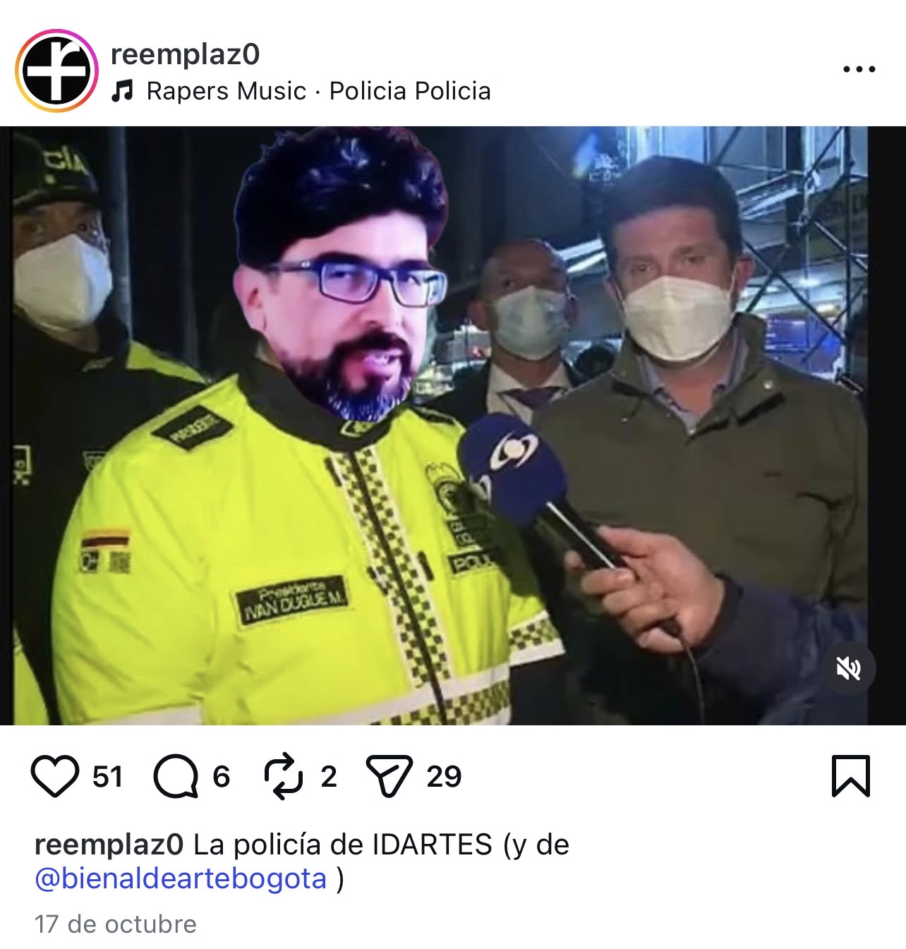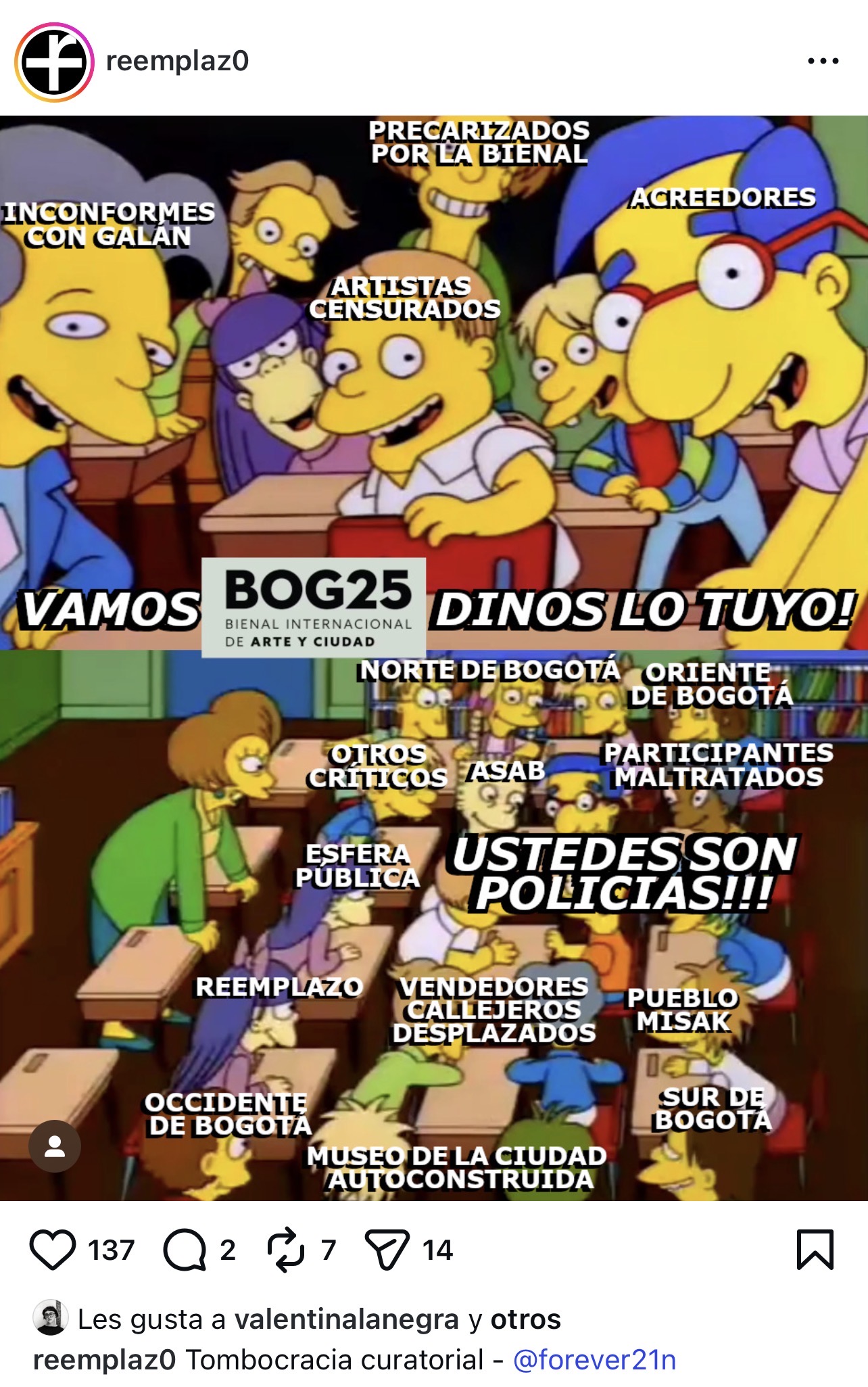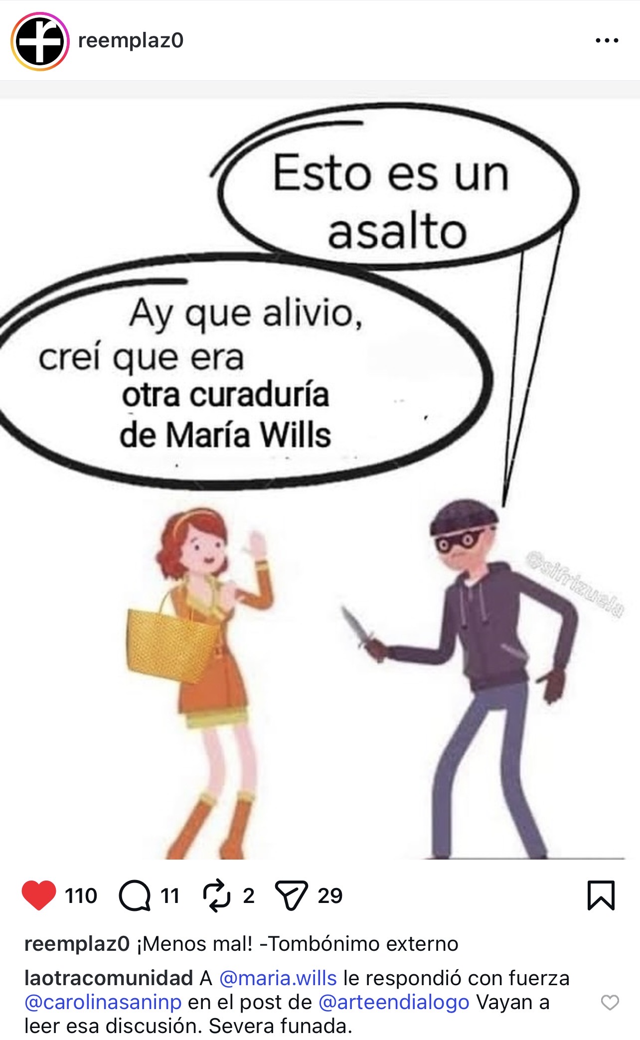 El «Manual de Campo para reconocer a la policía del arte» cambió el clima del debate. Desde una voz que formaba parte del dispositivo curatorial, la discusión dejó de ser principalmente argumentativa y comenzó a adoptar un tono de burla. Poco después, la respuesta visual apareció en el perfil de Instagram de Reemplaz0.org, donde el humor crítico de los memes devolvió la etiqueta de «policía del arte» a la propia Bienal y su equipo curatorial.