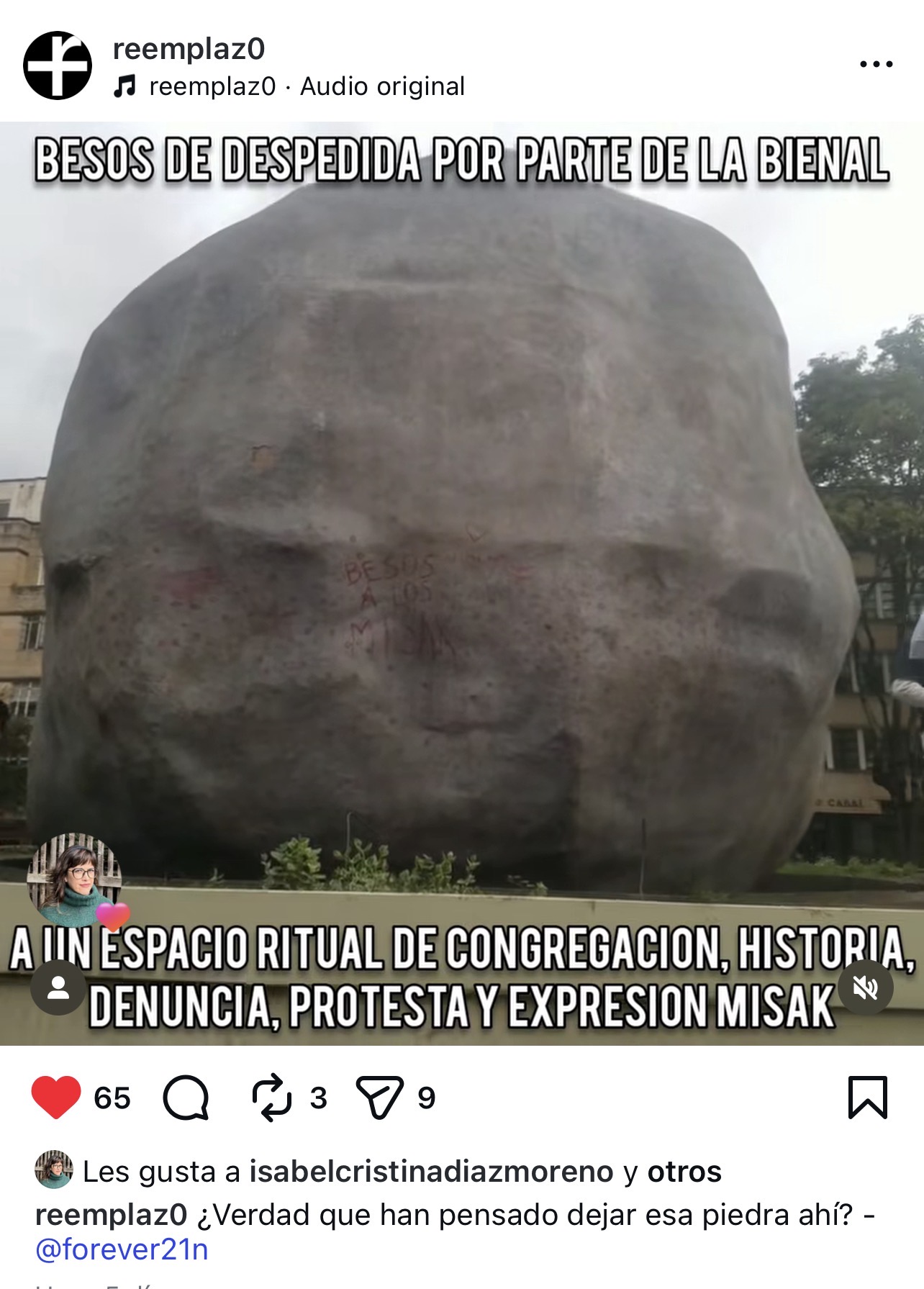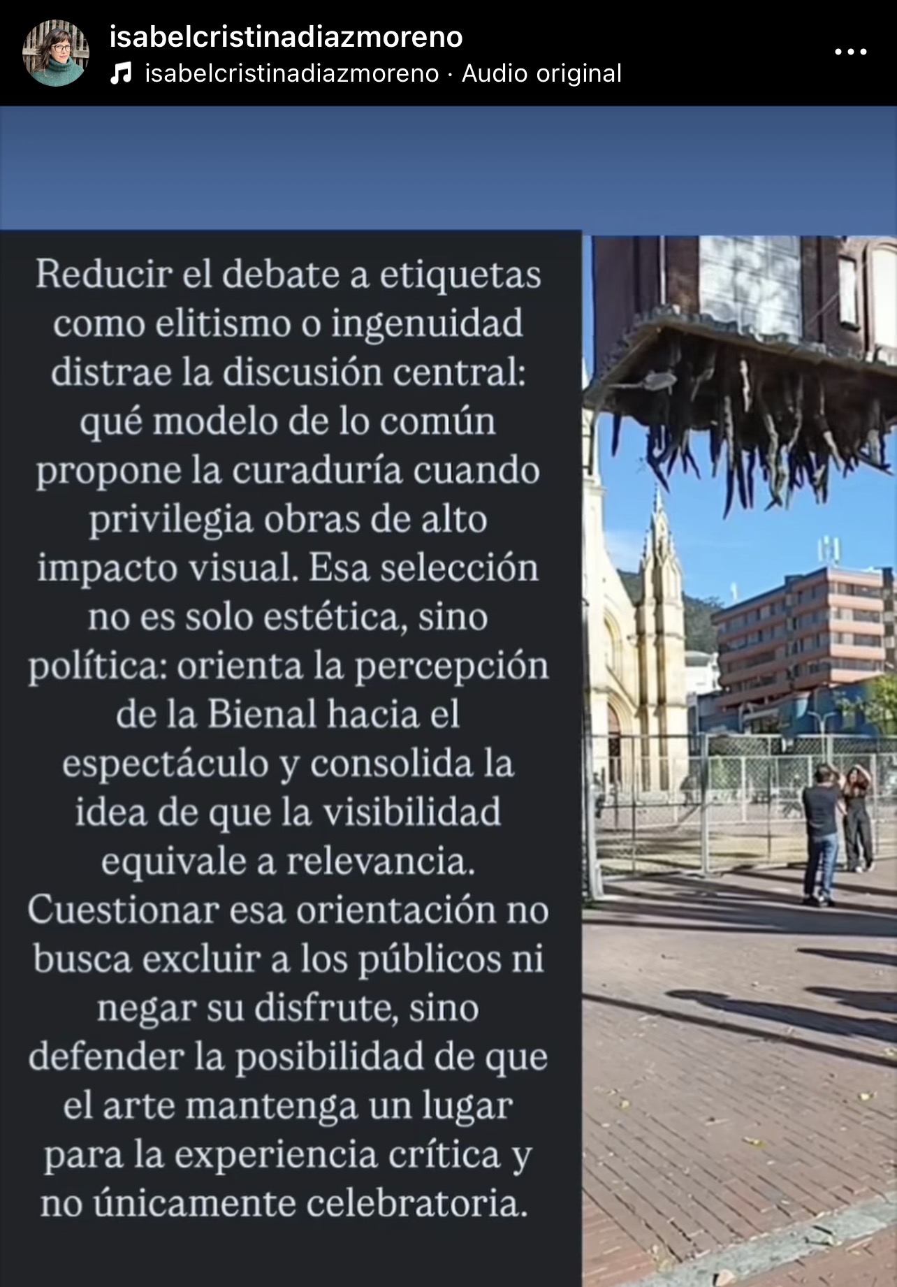Sin embargo, sí existían textos sobre obras y curadurías específicas, simplemente no formaban parte del radar institucional. En un video publicado hace un par de días, Carolina Sanín amplió sus críticas a la etiqueta de «policía del arte», a la museografía y a varias obras de la Bienal; el enlace se encuentra al final del dossier.