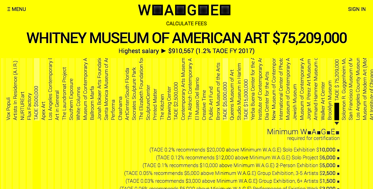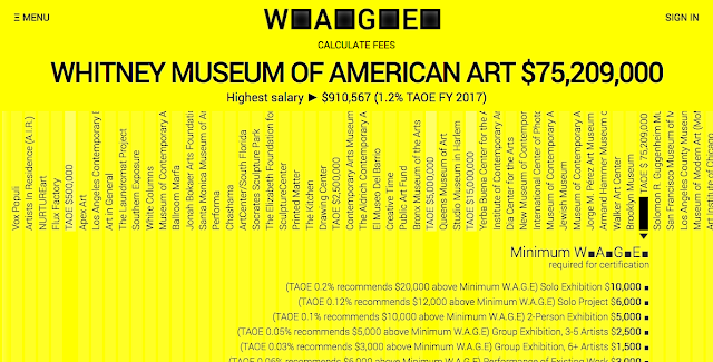 La calculadora toma como referencia el presupuesto anual de la institución y el salario más alto que paga cada una. Por ejemplo el MoMA tiene un presupuesto anual de más de doscientos cincuenta millones de dólares y el cargo mejor pagado recibe casi un millón doscientos cincuenta mil al año. Al poner el cursor sobre su nombre aparece una lista que va de los 10.000 US$ por una individual a los 50 $ la hora para performers (recordemos el caso de Dora García en el Reina). Se trata siempre de mínimos a partir de los cuales se pueden negociar mejoras.